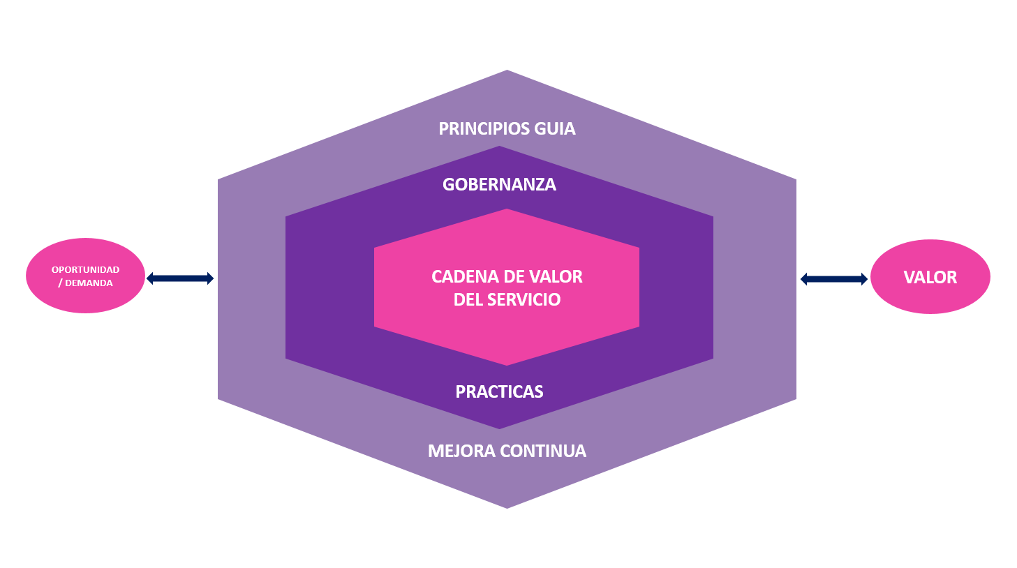 ITIL 4 menciona que el valor de un servicio es co-creado por la organización y el cliente con todos los partes involucradas, para conseguir objetivos o resultados esperados. El corazón de las 4 dimensiones de la gestión del servicio es el sistema de valor del servicio (SVS). El sistema de Valor del Servicio representa como los distintos componentes y actividades trabajan juntos, como un sistema para permitir la creación de valor. El SVS de cada organización tiene interfaces con otras organizaciones, formando un ecosistema que a su vez puede facilitar la entrega del valor de los servicios para dichas organizaciones, para sus clientes y para otras partesi involucradas.